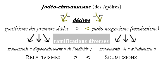 Le défi majeur pour le lecteur dans cette démarche « prospective » est sans doute de bien saisir la question des deux dérivations du judéo-christianisme, qui est la clef de compréhension de l’ensemble, et que condense ce schéma tiré du livre (p.354) et du site web lemessieetsonprophete.com :